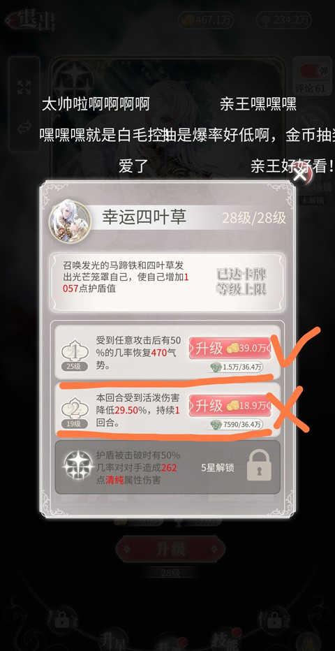 升级无属性的技能,比如这张《马背上的亲王》,主技能是加护盾,主升它没问题,但是技能2是“受活泼伤害减少”,尽量别升,技能1是“有几率恢复气势”,没得升的话可以升。
