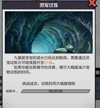 宠物宝宝到达了30级的时候就没法继续升级啦~这时候修真者可以点击试炼,一是通过挑战灵兽打赢之后就可以缩试炼的时间(失败了也没关系)二是试炼结束之后就可以继续往高等级升级
