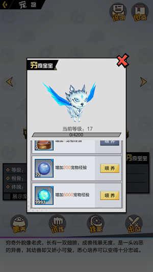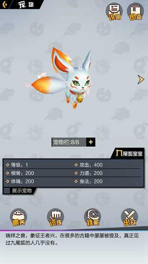 在“宠物”主界面修真者可以通过滑动选择自己心仪的宠物,培养之后,选择出战。