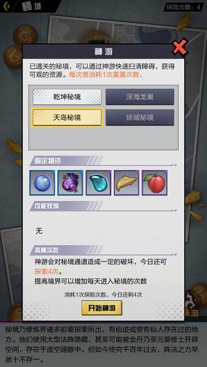已通关的秘境可以选择购买神魂秘诀开启“神游”功能,这个功能类似于副本的拓荒作用哦~