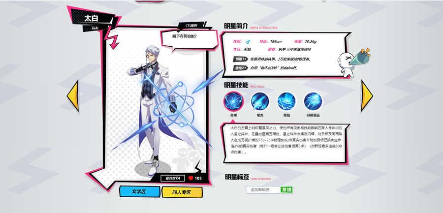 太白:远距离攻击,身份是完美执事:悟静:属于灵能型,带有控制技能,是个萝莉妹抖:红海儿:属于体术英雄,类似于战士。这是三个默认英雄,