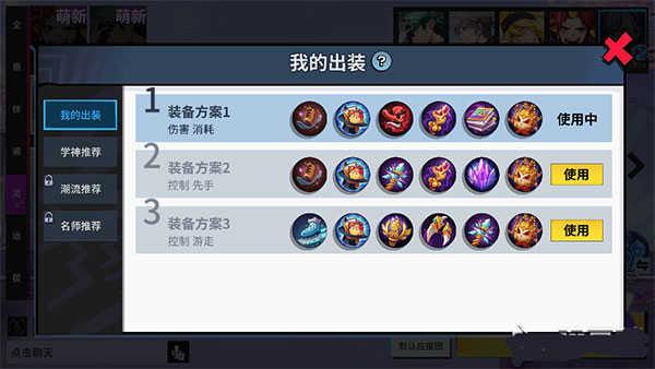同时还可以查看装备,选择适当的装备。装备分类中有我的出装、学神推荐、潮流推荐、名师推荐,玩家们可以根据己方的阵容以及自己的喜好进行选择。