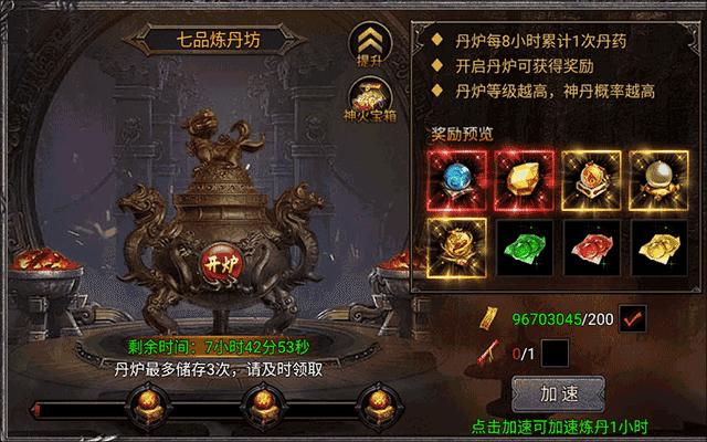 丹炉每8小时累计一次丹药,开启丹炉可以获得丹药,使用丹药可以全面提升角色属性,丹炉等级与天策府品阶挂钩,等级越高,神丹概率越高。