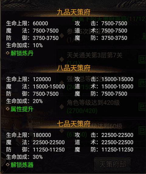 天策府随着品阶提升,对角色也有额外属性加成,其中九品可解锁丹炉进行炼丹,七品可解锁炼器炼制仙兵。