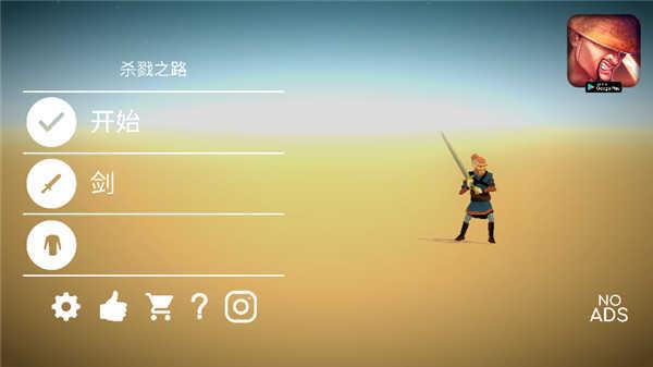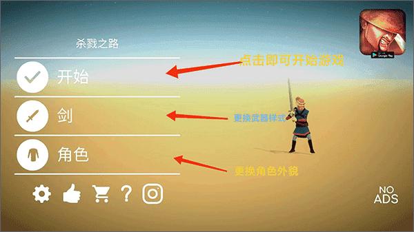 1、进入杀戮之路主页,可以看见有开始游戏,剑,角色等按键