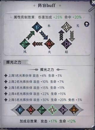 4、辉光之力(光族)主免伤满阵效果:攻击+30%,生命+20%,免伤+3%