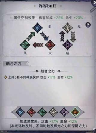 1、前期最高加成的阵容应该是“311组合”,意思就是选取水火风三族之一,然后选择三个伙伴,获得上阵3名同系伙伴的加成(攻击+11%,生命+8%),然后选取光族一个(攻击+4%,生命+3%),暗族一个(攻击+4%,生命+3%),总阵容buff达到(攻击+19%,生命+14%),比融合之力的加成要高些,这点加成可以在爬塔的时候起大作用了。