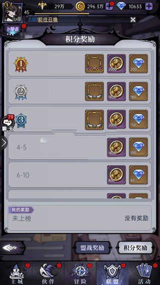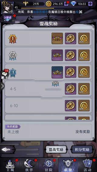 每次挑战结束后,胜者都可以获得相应的积分。积分会进行最后的排名。当每场比赛结束后,参战的伙伴都会继承上一场的血量和阵亡状态,如果战斗回合达到上限后,则伤害值总量高的一方会获得胜利。通过个人积分进行盟战排名,当获得第1名时可以获得盟战王者称号。玩家进行佩戴此称号可以提升攻击力和生命值。还可以获得联盟贡献值和金币道具奖励。