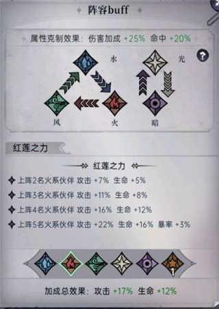 2、红莲之力(火族)主暴击满阵效果:攻击+22%,生命+16%,暴率+3%