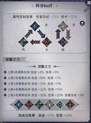 5、深黯之力(暗族)主伤害满阵效果:攻击+30%,生命+20%,伤害加成+3%