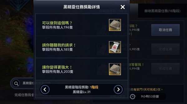 从黑精灵任务点击黑精灵任务奖励详情,可以确认黑精灵各阶段的任务目标和奖励。