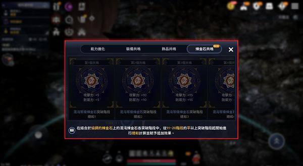 根据装置在协调的炼金石的混沌炼金石: 突破、激烈、幸运的突破阶段总和套用炼金石共鸣等级。