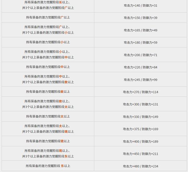 - 穿戴所有栏位的装备(主武器/辅助武器/头盔/盔甲/手套/鞋子6种)时,按照最低的潜力突破(潜力觉醒)阶段,可以获得额外战斗力。