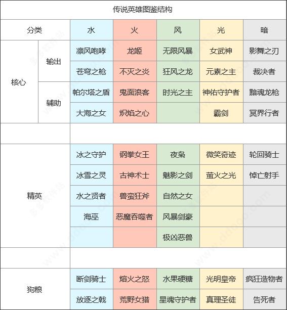 传说英雄,可分为核心、精英、狗粮