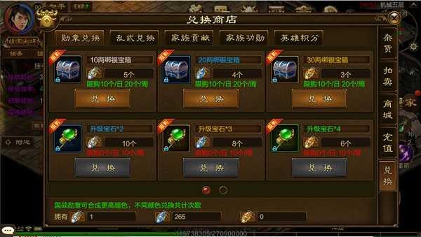 3、国战勋章可以在兑换商店用来兑换绑银、升级宝石和高级心法要诀。