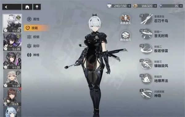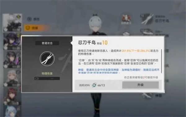 角色拥有固定的技能,玩家可以使用技能升级材料升级技能,提高技能的伤害值(控制时间等其他数值不提升,所以优先提升伤害类技能),升级技能所需的材料自物资关卡-因子采集产出,技能升级优先度低于角色等级提升,因为只有角色等级提升了,技能才可以提升等级。