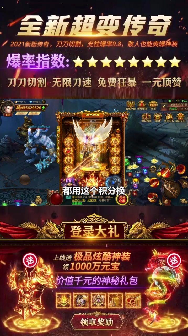 传奇高爆版,刀刀切割,半小时5转300级,上线就送永久VIP!