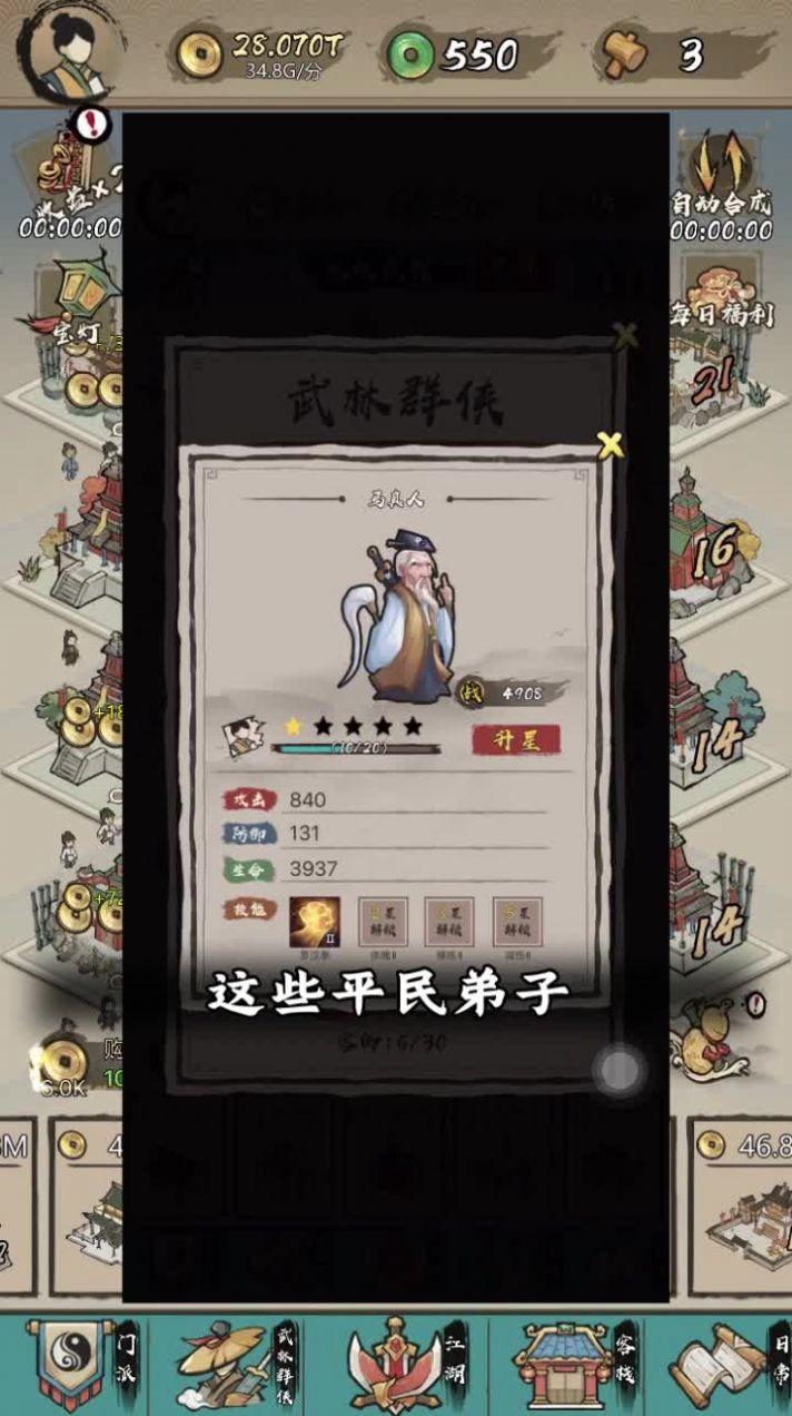 掌门单机版手游是一款放置武侠风格的门派经营游戏,玩家可以成为一代大侠,拥有自己的门派,你需要带领着弟子进行各种对决。通过挑战其他的门派,来提升你在武林中的威望,有着强大的实力,面对任何的挑衅都可以轻松的去应付。