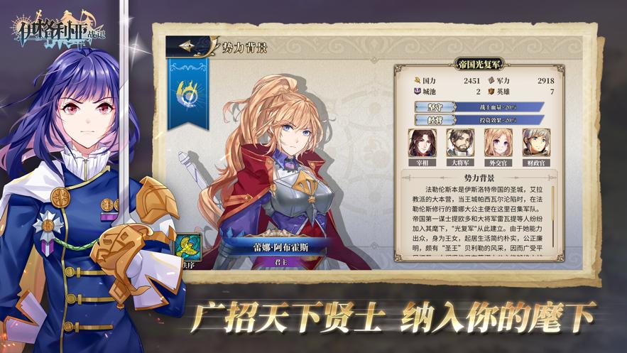 伊格利亚战记是一款设定于独立虚构宇宙中的轻型大战略型游戏,其特色在于融合了传统策略游戏玩法以及独特且多样化的英雄角色设计,呈现在精致的像素风格战斗场景动画中。该游戏构建了一个由多个国家组成的世界,每个国家都具有鲜明的特点。玩家将担任某一国家的领袖,通过在全局地图上发布命令来治理和扩张自己的版图,并指导军事行动,招募和指挥各式各样的武将,在战场上实施战术规划,以实现对领土的有效管理和国家的发展壮大。
