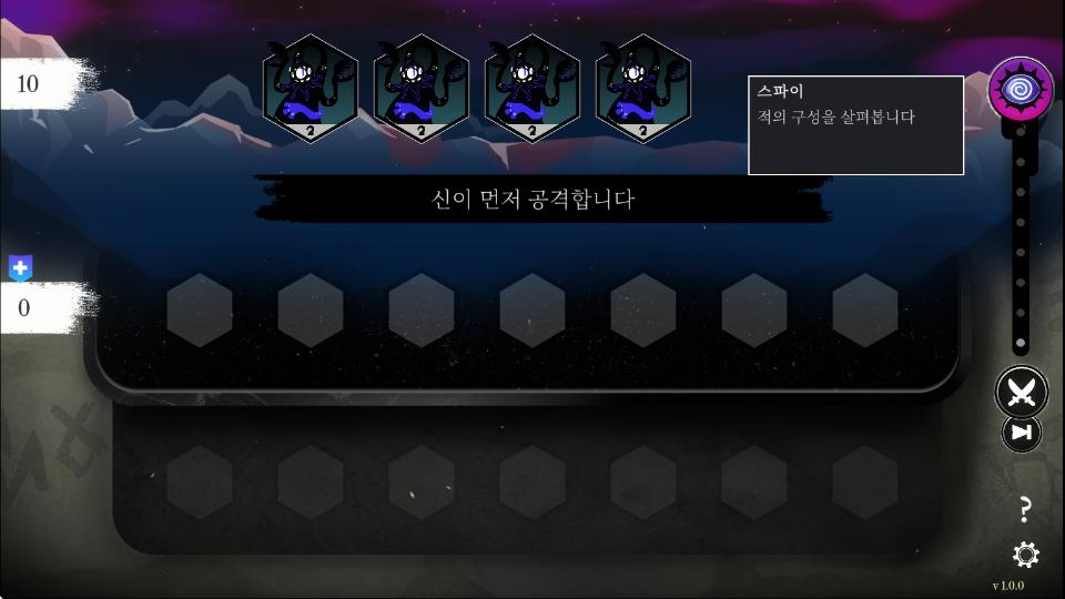 5、玩家每回合有10点费用可以使用,会在左上角显示,用完后就无法招募神明或者刷新。