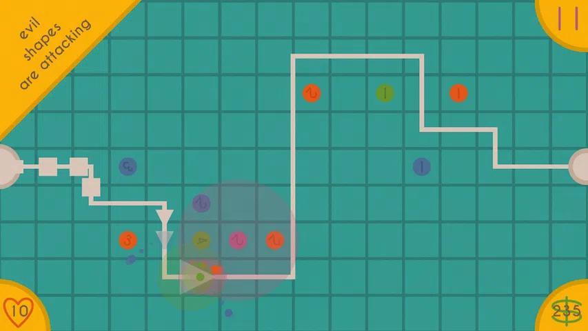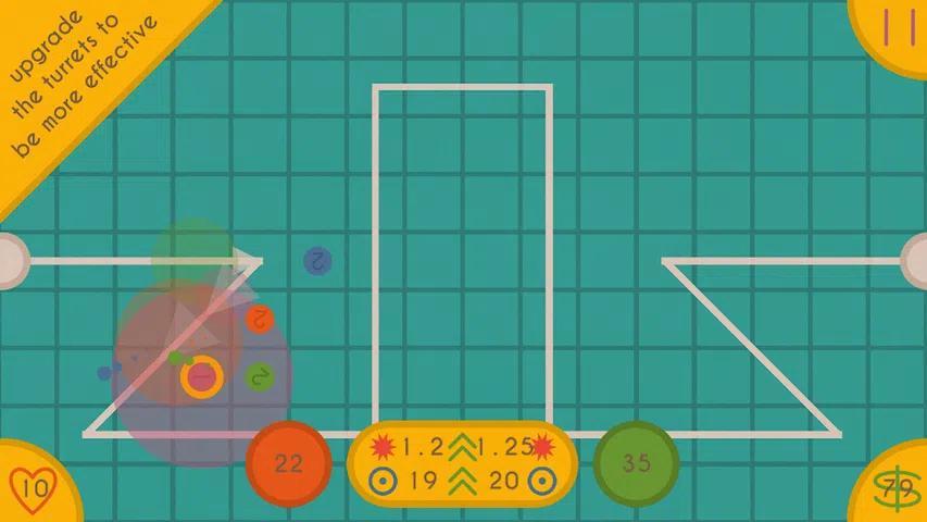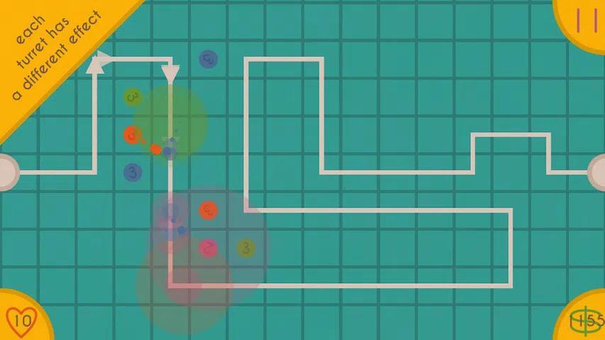 2.简约的场景搭配彩色圆点塔防单位,整体视觉干净利落。没有复杂特效和冗余元素,让玩家更专注于策略布局;