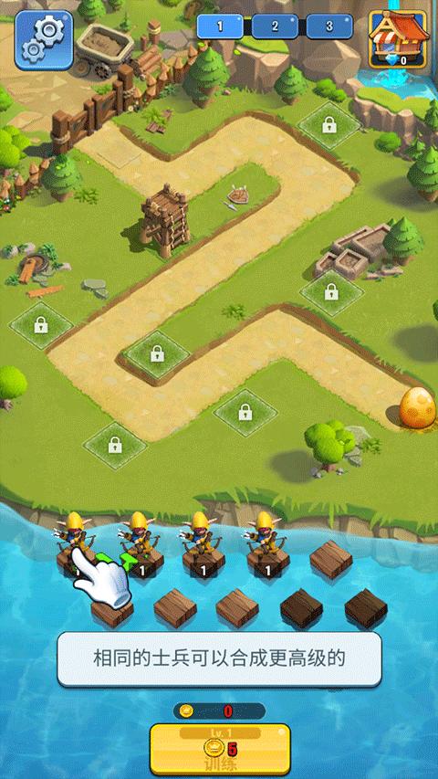 全新的升级方式摆脱了无聊的城建和造兵按钮。可以自由使用两个相同级别和类型的士兵来合成更高级的士兵!