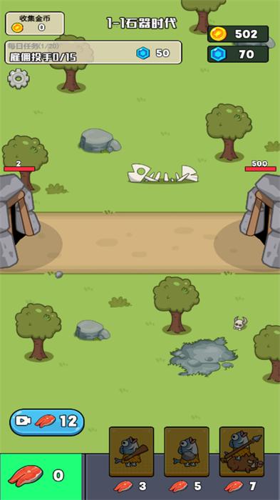 一款咸鱼怪和咸鱼之战!游戏中你需要升级你的咸鱼来对抗对方的强大咸鱼团,提升食物产出的速度,提升基地血量,来对抗敌人的攻击,慢慢升级进化从石器时代进化成为农民时代,发挥你的想象力,思考如何才能活下来吧!