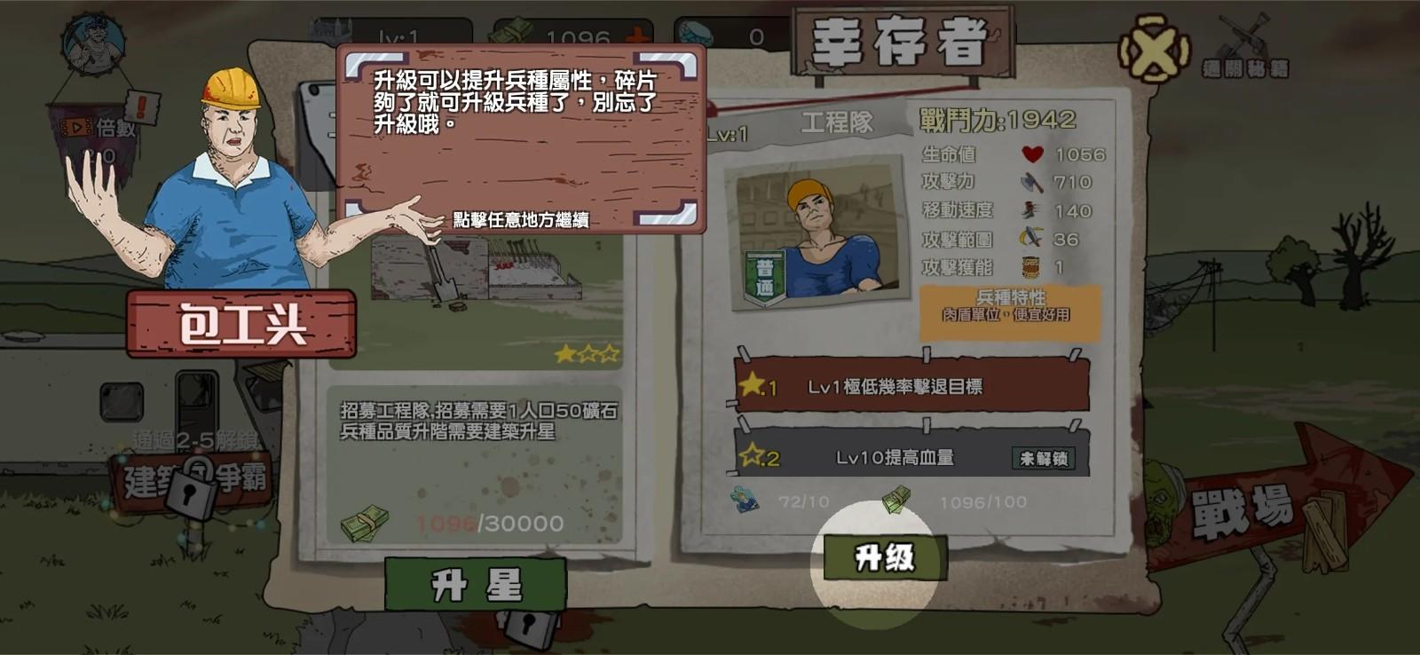 然后再点金钱站到3级,再出三个工兵,反正就是先把金钱站升到满级,然后狂出工兵顶怪直到有钱升级1000的建筑和1500的招募机车的建筑,然后就升级250的人口站狂出机车就可以了
