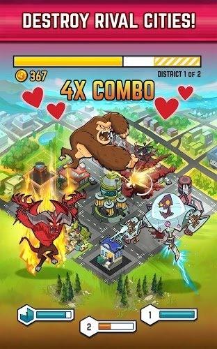 粉碎怪物城市破坏(smashmonsters)是coc类游戏,游戏中,玩家需要扮演一位邪恶的指挥官,任务是毫无理由地把其他玩家和邪恶npc的城市摧毁掉。游戏的玩法大致可分为两部分,核心的pvp和抽扭蛋。pvp系统可以再分拆为两个部分,一个是进攻:带着怪物出去抢钱;另一个是防守:种田盖大炮防止被别人抢。和coc相比,本作的战斗版图被简化为3×3的标准九格,一个格子塞一个建筑,双方按回合制行动,把建筑全拆完算胜利,被防御建筑全击杀算失败。