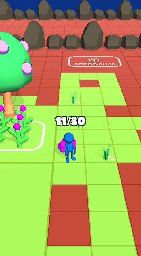 随意滑动屏幕控制开拓者移动,采集树上的果子,然后走到红色的地面上,变成绿色恢复生机,观察界面上方的进度条,到达目标后解锁新的区域然后继续扩建。