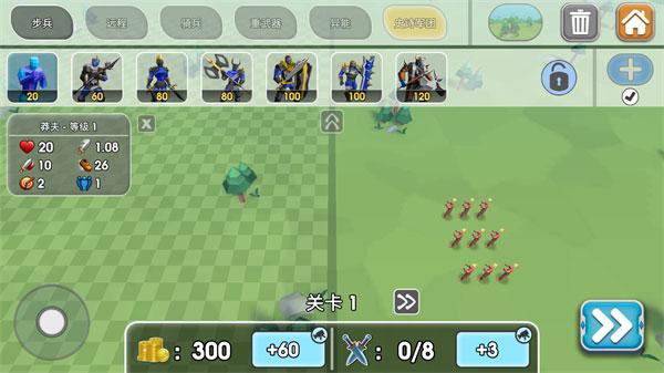 2、游戏的操作很简单,单人战役为闯关的玩法,进入游戏后可以看到敌方的阵营情况,你可以依次来部署你的队伍,只需点击上方的任一兵种,再点击空白位置,就可以将该兵种部署在此地,再次点击则可以取消本次部署。
