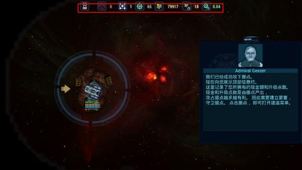7、现在我们再来介绍一下顶部的信息栏,这里记录了您所拥有的现金金额和升级点数,现金和升级点数是由据点产出,攻占的据点越多越有利,因此需要建立要塞守卫据点,点击据点即可打开建造功能。