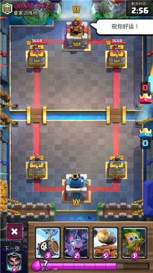 对战开始,被选入出战卡组中的卡牌会随机出现在卡槽中(卡槽中会同时出现四种卡牌,卡槽旁会显示下一张将出现的卡片),每位玩家初始会拥有5滴圣水(圣水随时间增长,最多储存10滴圣水),召唤不同的卡牌会消耗数量不等的圣水。