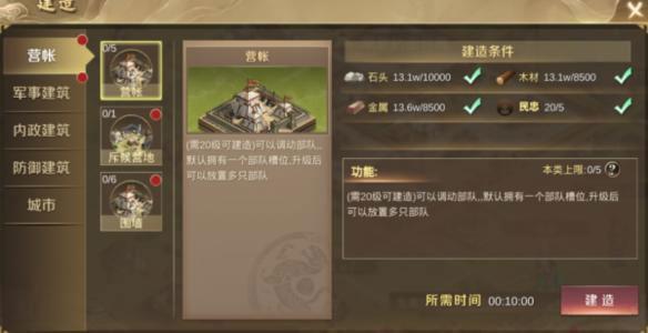 4、然后,最重要的来了:一,你可以直接建前锋营(直接秒建筑出),上阵第三个武将,轻松打三级地,或者慢慢跟着任务走等等级上去之后打三。强烈推荐第一个,因为不会卡资源,而且打三损失特别少。
