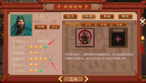 提档、降档、跳档:黄色星星代表武将基础档位;灰色代表掉档,可以吃较少的果子升;绿色是已经升的档。在五维属性处点击+号消耗道具,可以增长属性。