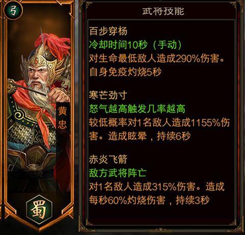 第一个武将是黄忠,因为黄忠是弓将中技能冷却时间段只有10秒,技能可以造成伤害290%还可以自身免疫5秒的灼烧伤害,黄中的第二个技能还可以造成眩晕6秒,黄忠还是推图白送的武将可所谓经济优势会。