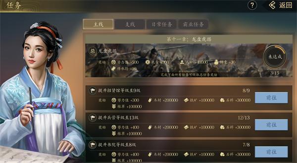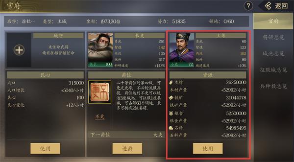 ④设置主簿:设置主簿可以提升粮草、石料、木材、铁矿的增长速度