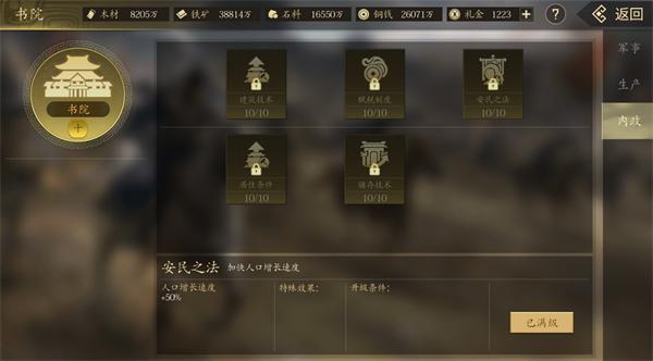②升级科技:可以通过升级科技-内政中的安民之法提升人口增长速度以及居住条件增加人口容量上限