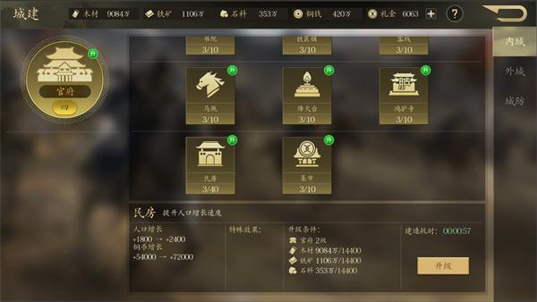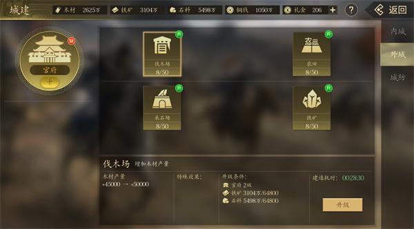 ②升级外城、伐木场、农田、铁矿、采石场:升级这些城建可以提升对应资源的每小时产量