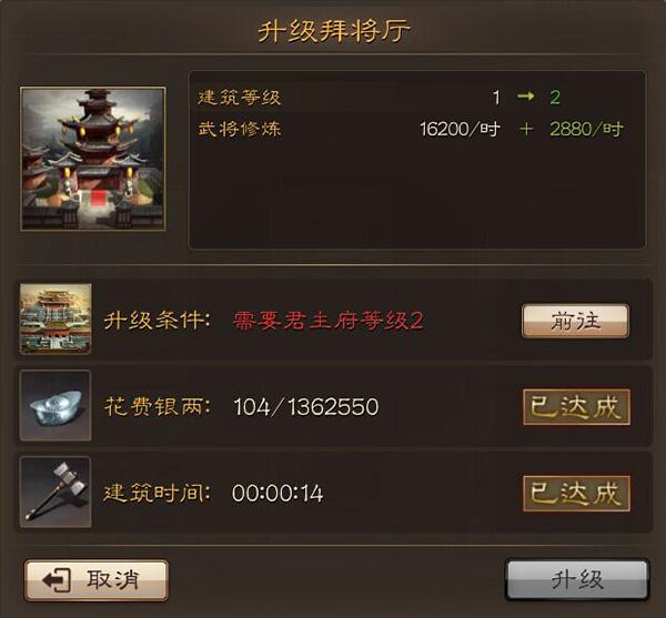 拜将厅顾名思义就是获得武将的地方,但是可别小看了拜将厅的作用,提升它的等级可以提升武将的修炼时获得的经验。如果再加上练功令加成的话,每天免费可以获取的经验也是很客观的,累计起来,就比其他玩家有更多的经验优势,这些变相就是战斗力的体现