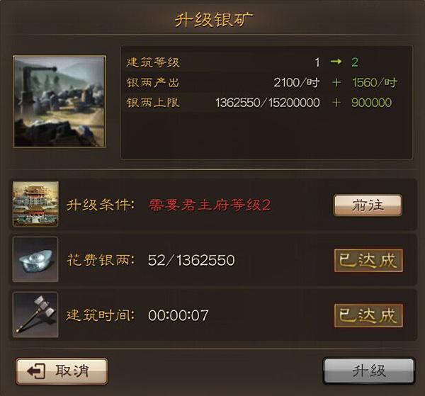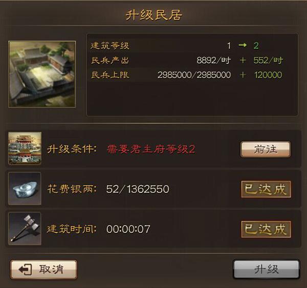 为什么把银矿和民居放在一起说呢,因为这两个建筑的功能很相似,银矿产出银子,民居产出民兵,他们的产出很稳定,无论你是主玩种田还是玩掠夺他人这种富有侵略性的玩,你都是要尽可能把银矿和民居升满。如果你追求极限收益,你要尽可能保持矿稿和征兵令的状态存在,因为他们直接提升银矿和民居的基础产量,重点是这两个物品很便宜而且参加活动也可以获取到