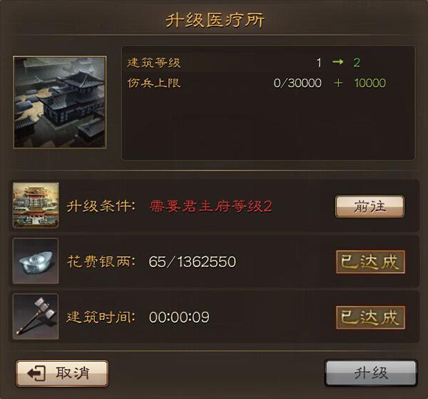 刚开始玩的时候,总感觉死兵是种负担,害怕兵损,但是后来我才重视到这个建筑,提升医疗所的等级可以提升伤兵的上限,多存一点伤兵,等需要用兵的时候就花费一定银两把他们招回来,这也是为什么每次打架我的兵都会比别人多的原因。至于医疗所的升级优先级,我推荐是量力而行,毕竟伤兵多少和自己玩的方式有关