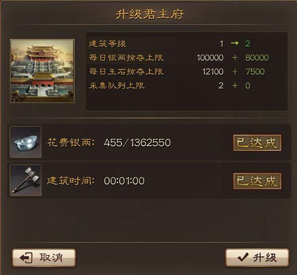 君主府会提升采集队列的上限,提升每日掠夺资源的上限,对于我这种种田玩家来讲,我会优先把君主府升级并且尽可能多占领一些农田来增加我的每日收益。升级君主府另外的原因就是其他建筑的等级不能超过君主府,所以说君主府要最优先升级