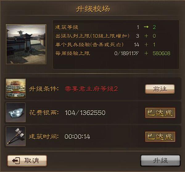 校场这个建筑其实就是存经验用的,但是万万不可忽略的一点!校场在特定等级的时候是可以提升出征队列上限的,出征队列多了,就可以同时对多个目标点进行发兵,极大的提升了效率,所以校场没必要每次都优先升级,可以把它放后面一点,一次性的升级,这个度怎么把握,就要靠各位看官自己了