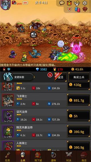 1、你可以不断复活那些因为战斗死去的骑士,请不断的升级自己勇士的各方面属性!