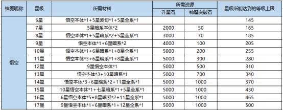 悟空属于SSR神魔,所以在升星上除本体外还需要暗系狗粮。所以大家在日常培养中一定要时刻留意积攒暗系狗粮,下面附上悟空每个星级升星所需材料: