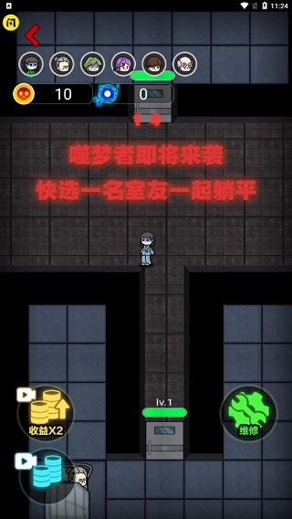 2、升级优先度:找好宿舍后优先提升床的等级和建造两个炮台,因为这个时候猛鬼还没有到来,所以优先提升床铺的等级快速获取金币,然后再去提升门的等级,之后床铺的等级可以暂停一下,优先提升门的等级,否则很容易被猛鬼突破,提升到需要电力的时候再去商店购买游戏机,否则会很容易被猛鬼突破;