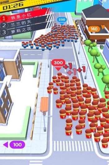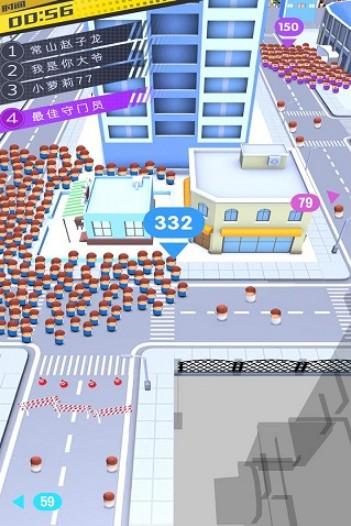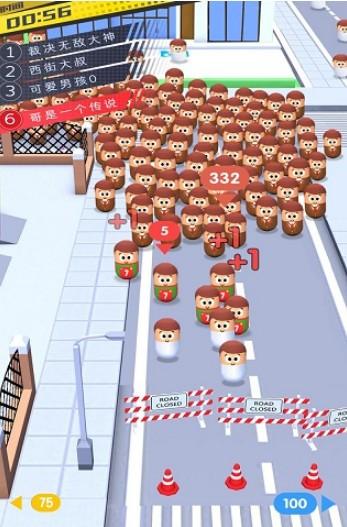 在为自己的队伍确定好颜色和名字之后你就能进入游戏了,玩家能通过直接在屏幕上滑动让画面中的小人跟着移动,还要将场景中白色的自由人全部拉进自己的队伍,你需要接近这些白色的自由人,这样他们会被归入到我们的队伍中,你提要让队伍变得越来越壮大,还要小心不要被吃掉。