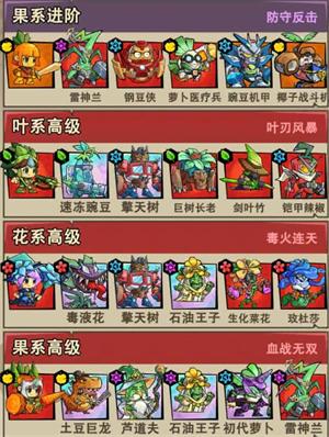 4、果系主角、雷神兰、钢豆侠、萝卜医疗兵、豌豆机甲、椰子战斗机
