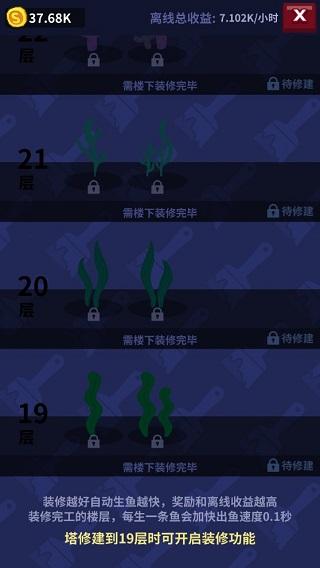 待塔修建到19曾可开启装修功能,装修越好的房间自动生鱼的速度越快,奖励和离线收益越高!